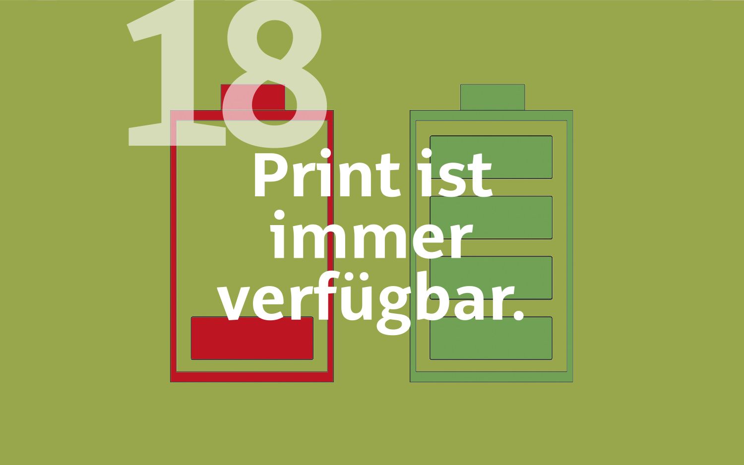 Akku leer? Print funktioniert selbst ohne Strom. Auf Papier lassen sich Informationen dauerhaft speichern. Während digitale Zeichen nach einem Systemwechsel oft verloren gehen, haben Bücher sogar schon Brände überstanden.
